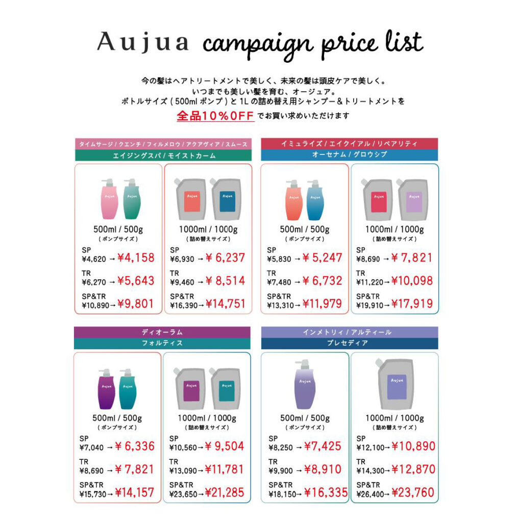 ボトルサイズ(500㎖)と1ℓ詰め替え用シャンプートリートメント全品10%OFF