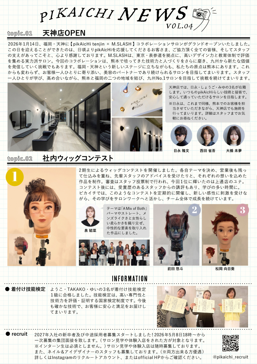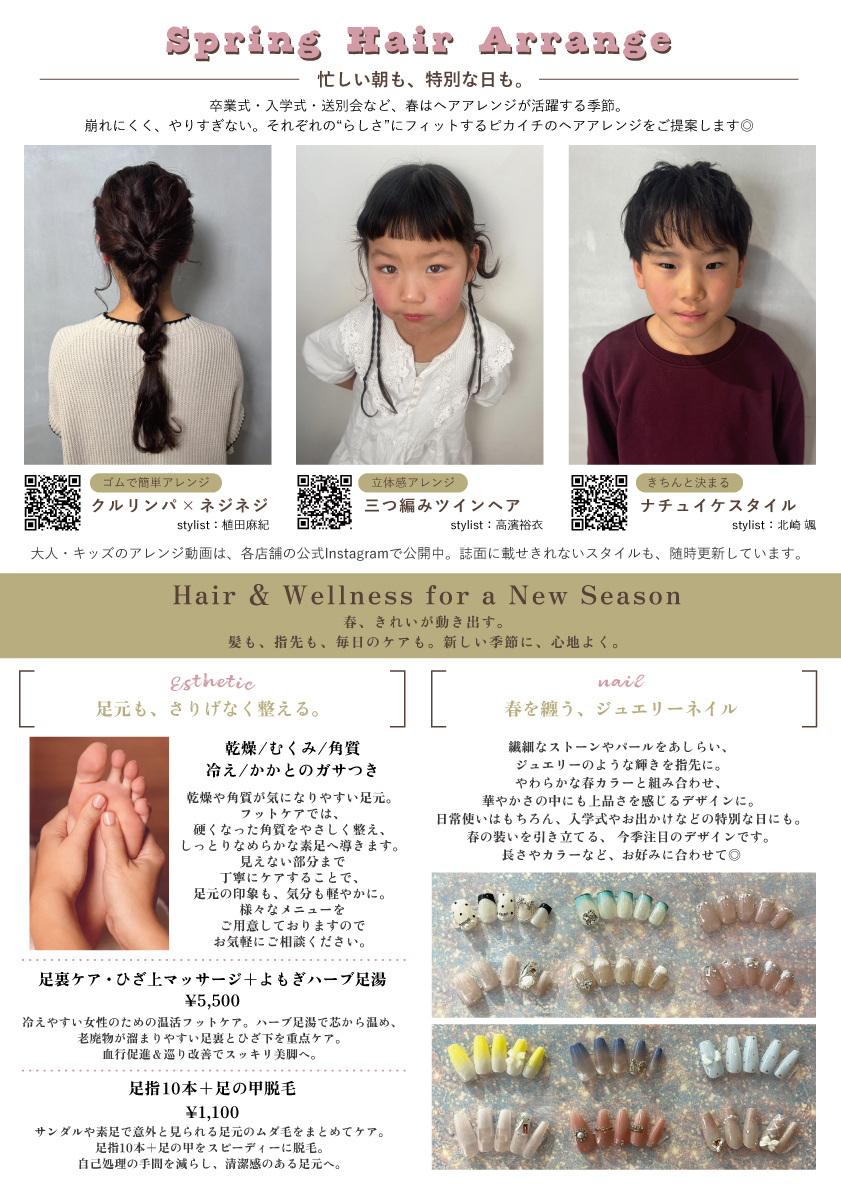 春の卒入学に合わせたヘアセット(もちろん普段にも使えます◎)や、春にオススメのフットケアメニューやジュエリーネイル、天神店や社内コンテストの内容と盛りだくさん◎